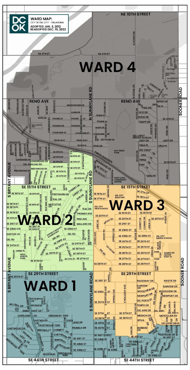 The City Council is the policy-making body of city government, and they appoint the City Manager, who directs the city’s day-to-day activities. The Council Members are elected for four-year overlapping terms and represent the four wards (see below) of Del City. The Mayor is elected at-large by the entire community and serves a four-year term.