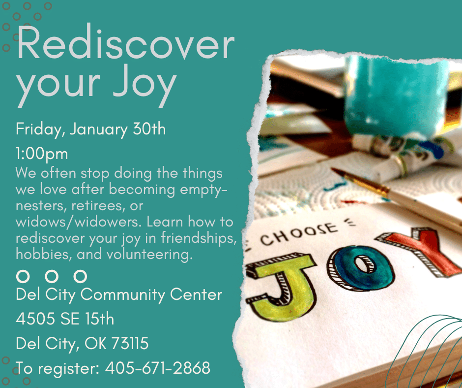 Friday, January 30th 2026 from 1pm-2pm. OSU Extension Workshop “Rediscover Your Joy”. Retirement, loss, and changing family dynamics can create feelings of uncertainty and disconnection. In this supportive discussion, Lisa Hamblin, Family and Consumer Sciences Educator from the Oklahoma County OSU Extension, will support those navigating these significant life transitions by encouraging participants to rebuild […]